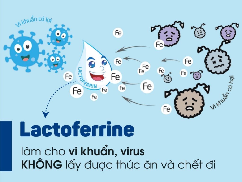 Lactoferrin là chất đạm thuộc họ Transferrin, có tác dụng bổ sung sắt, phòng ngừa nhiễm khuẩn, kích thích hệ thống miễn dịch hoạt động tốt hơn, có nhiều trong sữa mẹ, sữa công thức.